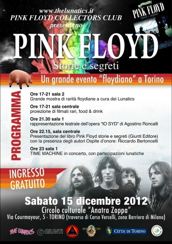 Sabato 15 dicembre 2012 al circolo "Anatra Zoppa" di Via Courmayeur, 5 a Torinoè stato presentato il libro dei Lunatics intitolato (come tutti sapete!)"Storie e Segreti". Numerosi gli appassionati e i curiosi presenti, che hanno potuto assistere, già dal primo pomeriggio alla mostra di vinili e manifesti, oltre alla proiezione continua di filmati rari dei Pink Floyd. In serata si è potuto assistere alla rappresentazione "IO SYD" di AgostinoRoncallo, seguita dalla presentazione ufficiale del libro "Storie e Segreti", ospite d'onore Riccardo Bertoncelli. La serata si è chiusa con il concerto dei Time Machine, giunti ora al decimo anno di attività! Fabrizio Taricco |